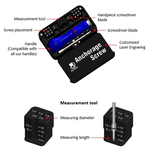 Multifunctional design can be put in our handle, screwdriver blades, handpiece screwdriver blade, anchorage screws, convenient for storage and carrying.